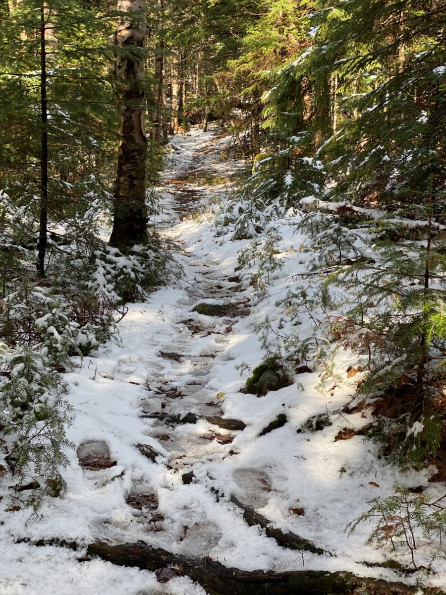 About two miles up, the snow and ice form. It’s beginning to look alot like Christmas played on a loop in my head, and I even snapped a photo of some snow capped Christmas trees in their natural habitat, which was a first for me. And I just kept on hiking. My boots sloshing through ice, mud, and deep pockets of river that allowed no getting around.